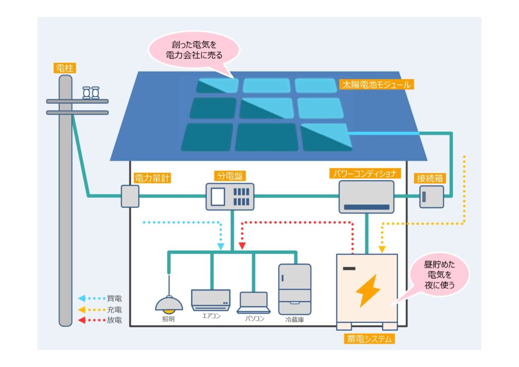 昼間発電した電気の内、余った電気(余剰電力)は電力会社に買い取ってもらうことが出来ます。