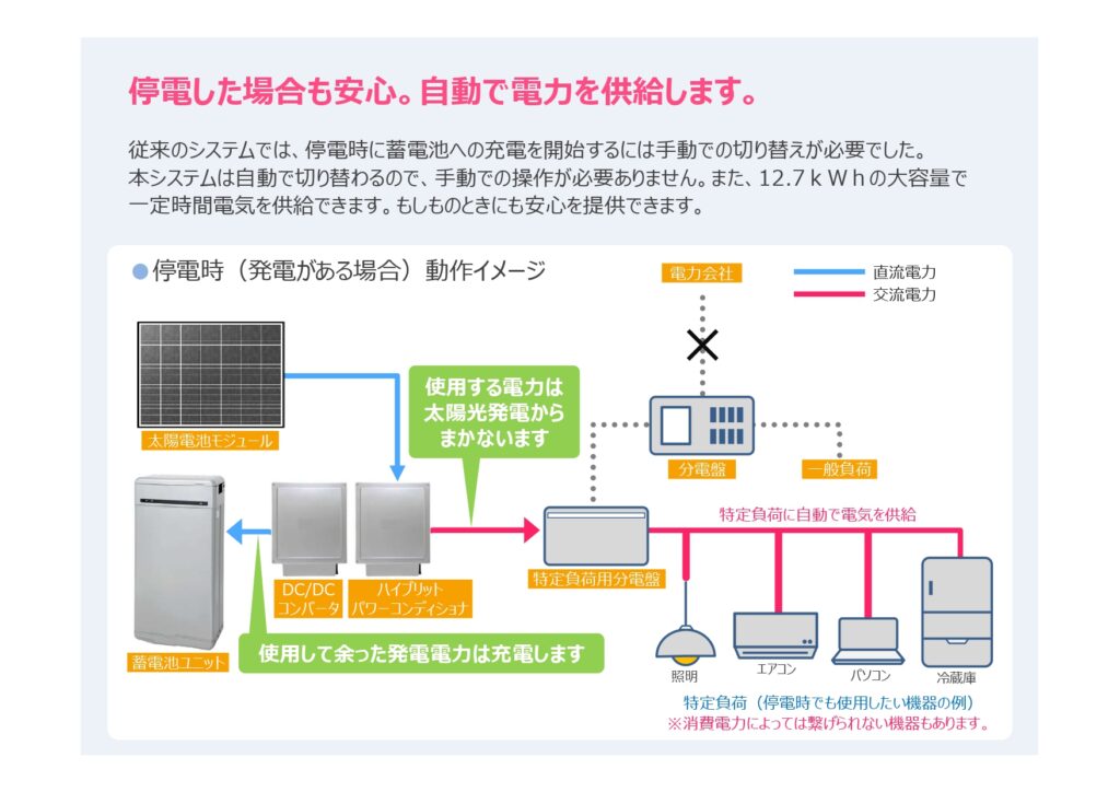 地震や台風など~発電した電気の一部を使うことができます、さらに蓄電池があれば蓄電池からの電気も利用できます。